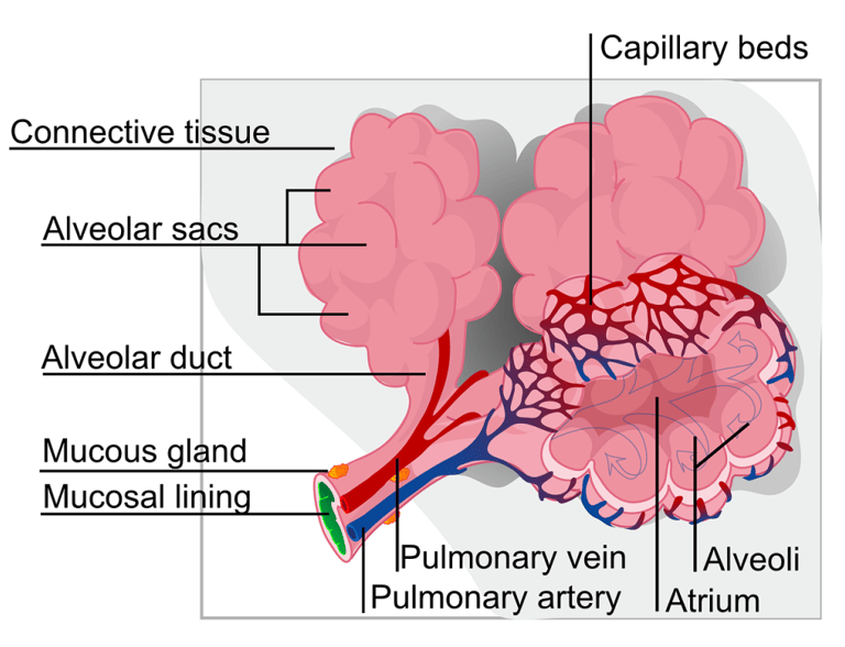 Nefes alırken, hava bu alveollere dolar. Burada, ince zarların arkasında oksijen kana, karbondioksit kana verilir.