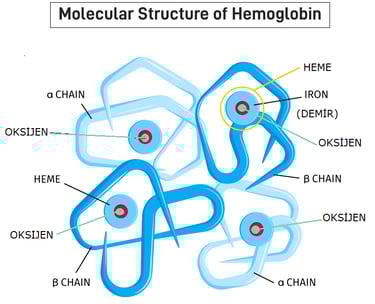 Hemoglobin (Hb), dört adet polipeptit zincirinden oluşur. Her zincirin kalbinde, bir "heme" grubu ve onun ortasında pusuya yatmış bir demir atomu vardır.
