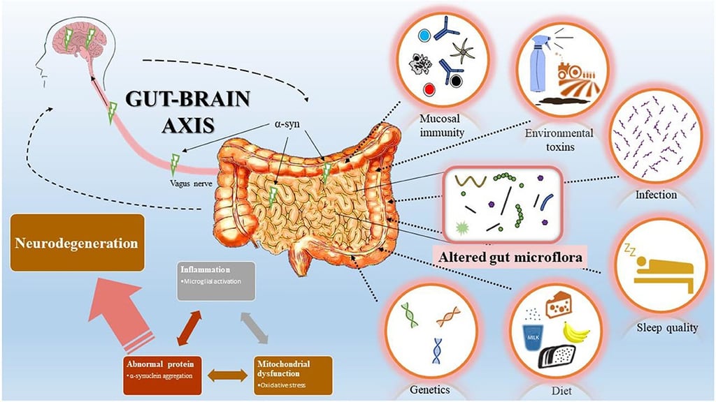 Gastrointestinal (GI) sistem ile merkezi sinir sistemi (MSS) arasında çift yönlü etkileşim. Şematik gösterim, Braak'ın GI sisteminden başlayan Parkinson hastalığı (PD) ilerleme modelini özetlemektedir. GI mukozal bağışıklığında, çevresel toksinlerde, enfeksiyonda, uyku kalitesinde, beslenmede ve genetikte meydana gelen değişiklikler bağırsak mikroflorasını değiştirir ve inflamasyona, mitokondriyal disfonksiyona ve anormal protein birikimine neden olur. GI sistemindeki α-sin birikimi, vagus siniri aracılığıyla MSS'ye yayılır ve dopaminerjik nöron dejenerasyonuna yol açar. (Chao Yin-Xia, Gulam Muhammad Yaaseen, Chia Nicholas Shyh Jenn, Feng Lei, Rotzschke Olaf, Tan Eng-King 2020)