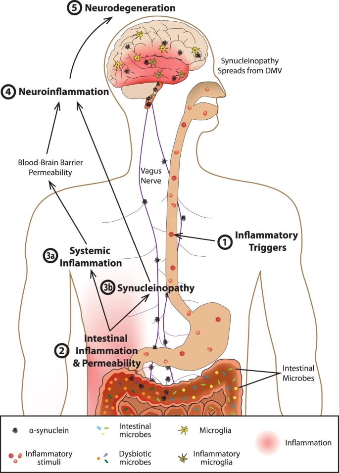 Parkinson: Bağırsakta başlayan bir protein bozulması (5alpha-synuclein), Vagus siniri üzerinden beyne tırmanarak hareket bozukluklarına yol açabilir.
