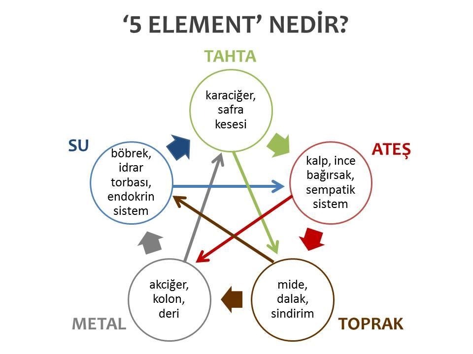Benzer şekilde, Çin tıbbının 5000 yıllık geçmişe sahip Beş Element Teorisi de insanın yapısını ve hastalık eğilimlerini doğanın beş temel unsuru — Metal, Su, Ağaç (Tahta), Ateş ve Toprak — üzerinden açıklamıştır.