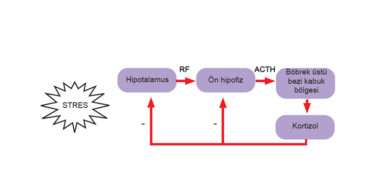 Hipotalamus bu mesajı alır almaz vücudu alarma geçirmek için komut zincirini başlatır. Bu zincir, beynin hormonal kontrol merkezi olan hipofiz bezini uyarır. Hipofiz, ACTH (Adrenokortikotropik hormon) adlı bir sinyali kana salar. Bu sinyal, böbreklerin üzerinde yer alan adrenal bezlere (böbreküstü bezleri) ulaşır ve orada kortizol adlı güçlü bir stres hormonunun üretimini başlatır.