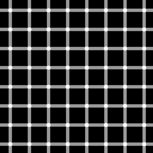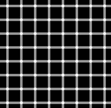 Bir parıltılı ızgara ilüzyonu. Şekil, konum, renk ve 3D kontrast kesişme noktalarında siyah noktalar yanılsaması üretmek için birleşiyor. Hermann'ın ızgara illüzyonu ve Mach bantları biyolojik bir yaklaşımla en iyi açıklanan iki yanılsamadır. Lateral inhibisyon, algı bölgesindeki retinanın ışık ve karanlık reseptörleri aktif olmak için birbirleriyle yarış içerisine girerlerken birbirlerini etkilemeleridir. Bu açıklama Mach bantları izlerken renklerin etrafında neden artan ve azalan parlaklıklar gördüğümüzü açıklamaktadır. Bir reseptör aktifleştiğinde kendine komşu reseptörü inhibe eder. Bu inhibisyon kenarları vurgulayarak, kontrast oluşturur. Hermann ızgara illüzyonunda gri noktalar kesişim yerlerinde görülürler çünkü artmış karanlık çevrenin sonucu olarak inhibitör cevap oluşmuştur.