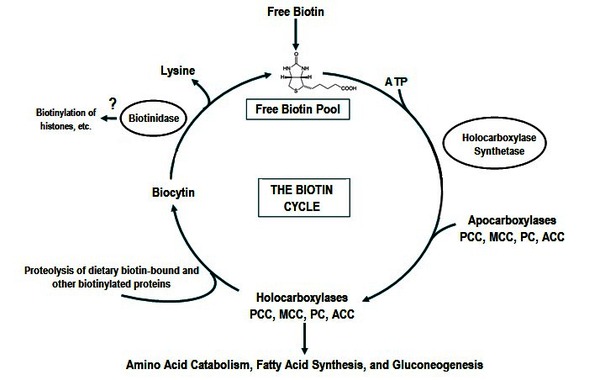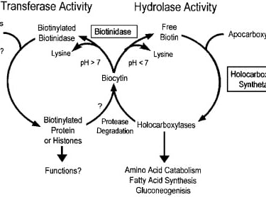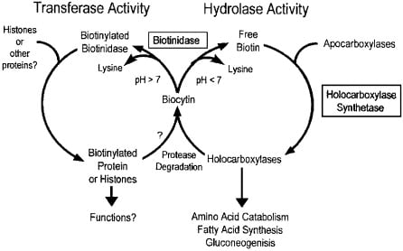 Biyotin, vücutta beş kritik karboksilaz enziminin kofaktörüdür. Bu enzimler, bikarbonattan alınan karbondioksiti organik moleküllere bağlayarak metabolik yolların devamlılığını sağlar: