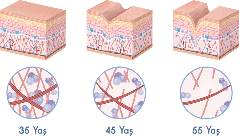 Yaşlanma süreciyle birlikte ciltte çeşitli fizyolojik değişiklikler meydana gelir. Kolajen ve elastin üretimi azalır, bu da cildin sıkılığını kaybetmesine, kırışıklıkların oluşmasına ve sarkmalara neden olur. Ayrıca hücre yenilenme hızı düşer, cilt daha ince ve hassas hale gelir. Hyaluronik asit seviyeleri azalır, bu da cildin nem kaybetmesine ve kurumasına yol açar. Güneş ışınları, çevresel faktörler ve yaşam tarzı gibi etkenler de yaşlanma belirtilerini hızlandırabilir.