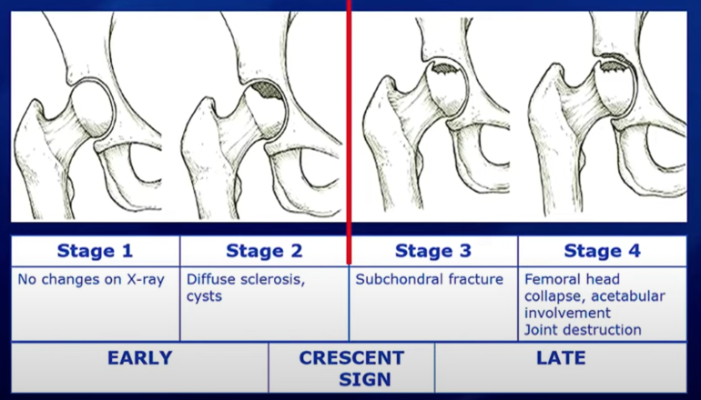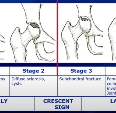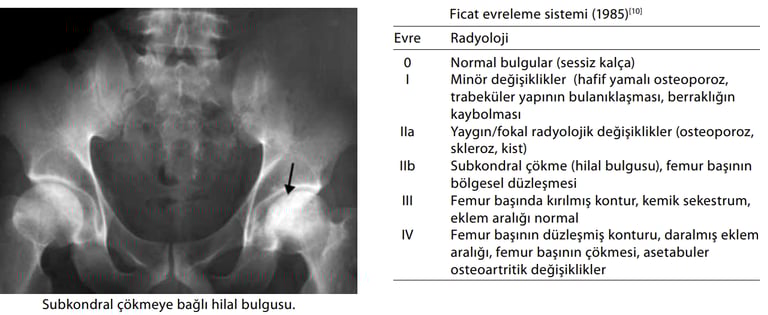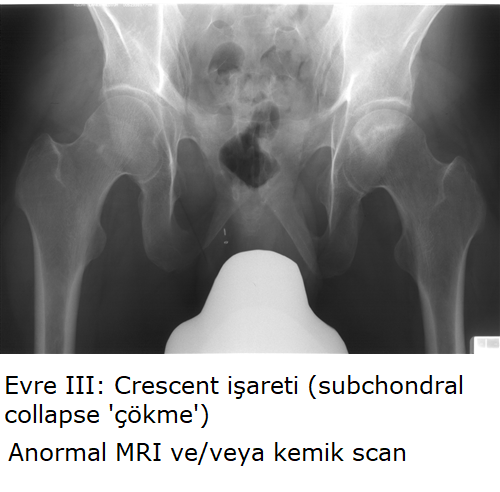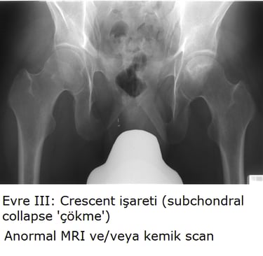 Evre III: Crescent Sign (Hilal Belirtisi). Şiddetli ağrı, subkondral kırık ve çökme başlar. (LR+ - ∞ - Biyomekanik iflas)
