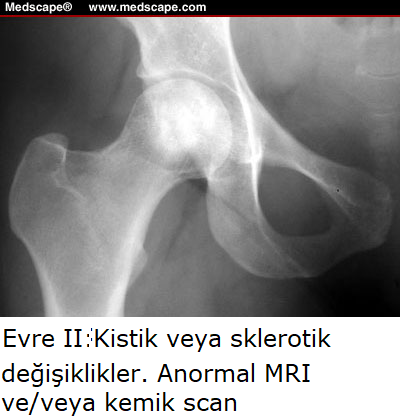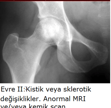 Evre II: Skleroz, kistik değişiklikler. Belirgin ağrı. (LR+ 10.0 - Röntgen tanısaldır)