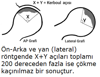 Kerboul Açısı: Nekrotik lezyon hacmi. Aksiyel ve koronal açı toplamı >200° ise çökme kaçınılmazdır. Yük taşıyan alanda (lateral tutulum) risk LR+ 7.2 artar.