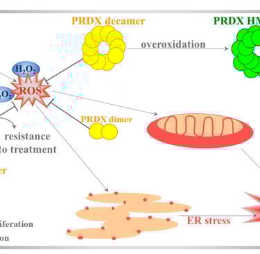 Onkoprotein Rolü: Çoğu kanser hücresi, PRDX'i yüksek düzeyde üretir. Bu, PRDX'in kanser hücreleri için bir hayatta kalma güçlendiricisi olarak hareket ettiğini gösterir. PRDX, kanser hücrelerini kemoterapi ve aşırı oksidatif stresten koruyarak metastazı ve kemorezistansı (ilaç direncini) teşvik eder.