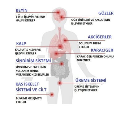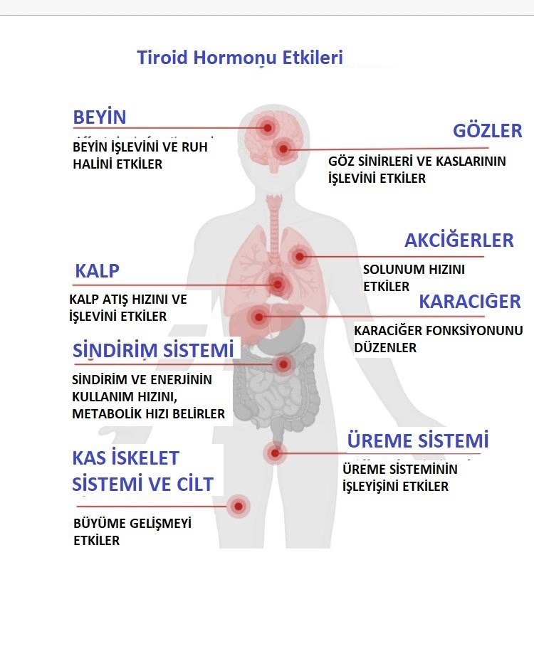 Tiroid hormonları (T3 ve T4) vücuttaki her hücrede reseptörlere sahiptir ve sindirim, kalp-damar, şeker, lipid, protein ve kemik metabolizması, vücut ısısı, safra ve karaciğer fonksiyonları gibi temel sistemleri etkiler. TSH (Tiroid Stimülan Hormon), hipofizden salgılanır ve tiroid hormon üretimini uyarır; ancak yalnızca T4 ve TSH tetkikleriyle tiroid hormon fonksiyonlarının tümü hakkında fikir sahibi olunamaz.