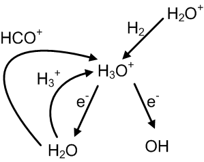 Kritik Rol: H3O+, yıldızlararası iyon-nötr kimyasında çok önemli bir rol oynar, çünkü hızlı bir şekilde su (H2O) veya hidroksit (OH-) üretebilir. Gökbilimciler, H2O'nun doğrudan gözlemi zor olduğu için, H3O+'ın varlığını kullanarak yıldızlararası bulutlardaki su bolluğunu tahmin ederler.