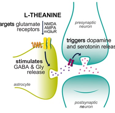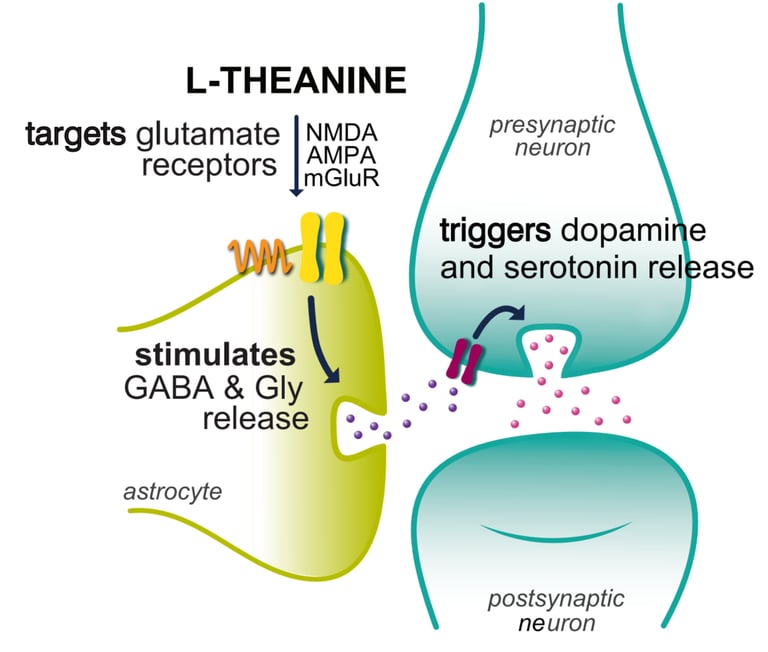 L-theanine, yapısal olarak glutamat ve GABA'ya benzeyen bir amino asittir. Kan-beyin bariyerini yaklaşık 30 dakika içinde geçer ve şu etkileri gösterir: