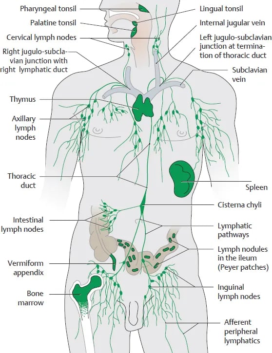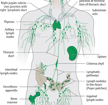 Lenfoid Organlar: Dalak, Timus, Bademcikler ve Peyer Plakları (bağırsak duvarında) bu sistemin hayati bileşenleridir.