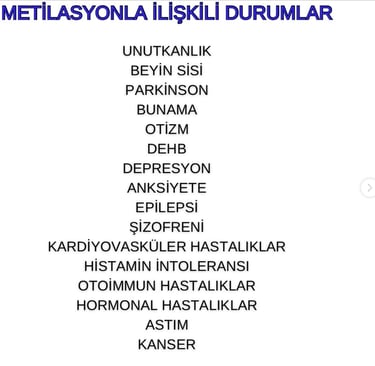 Kanser: Metilasyon, DNA onarımı ve genlerin susturulmasında (epigenetik) kritik rol oynar. Döngüdeki aksaklıklar ve toksik yük birleşince, DNA hasarı ve tümör baskılayıcı genlerin susturulamaması riski artar.