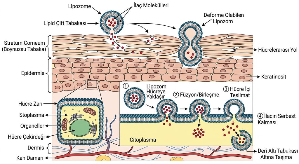 Topikal (cilt üzeri) uygulamalarda en büyük engel, "tuğla ve harç" (keratinositler ve seramid ağırlıklı lipid matris) modeline sahip, dışarıdan madde girişini reddeden Stratum Corneum'dur. Kozmetikte stratum corneum (derinin en üst, ölü tabakası), hidrofilik moleküllerin geçişini engelleyen zorlu duvarıdır. Standart kremler cildin sadece yüzeyinde kalırken, optimize edilmiş (50-200 nm) topikal lipozomlar şu mekanizmalarla çalışır: