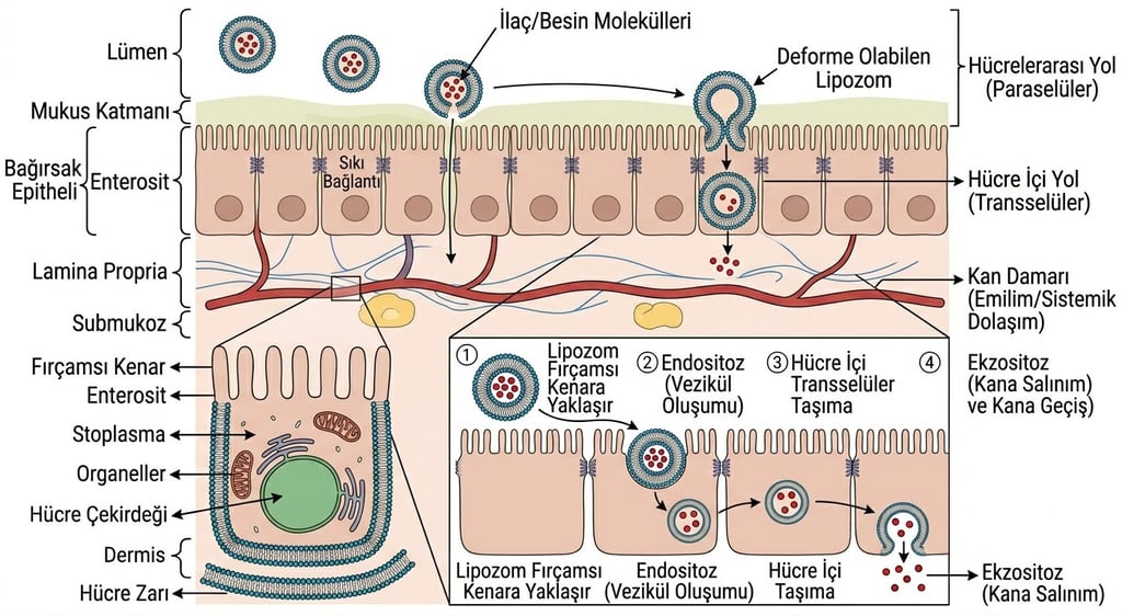 Karaciğeri By-Pass Etmek (Lenfatik Absorpsiyon): Bağırsak duvarındaki enterositler, lipozomun yapısını bir yağ damlacığı (şilomikron) gibi algılar. İlaç, kapı toplardamarı üzerinden karaciğere gidip parçalanmak yerine, doğrudan lenfatik sisteme emilir. Bu ilk geçiş eliminasyonunun (first-pass effect) atlatılması demektir.