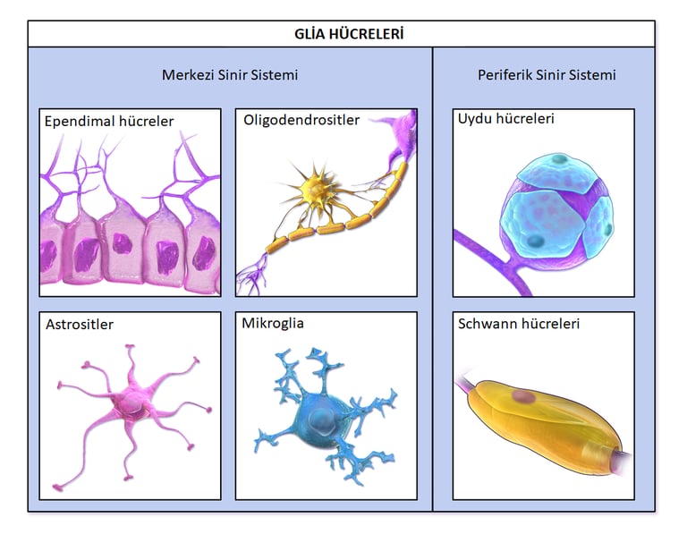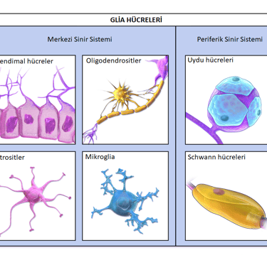 2. Glia Hücreleri (Destek ve Koruma) Nöronların sağlıklı çalışabilmesi için gerekli ortamı sağlayan, besleyen ve koruyan "yapıştırıcı" hücrelerdir (sayıca nöronlara eşittirler). Başlıca tipleri ve görevleri şunlardır: