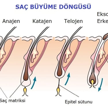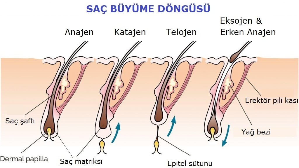 Saç uzar, sonunda dökülür ve yerine yeni saçlar gelir. Bu dört aşamada gerçekleşir. İlki, hücrelerin saç kökünde hızla bölünerek, saç gövdesini yukarı ve dışarı doğru ittiği anajen fazdır. Bu faz yaklaşık 2 ila 7 yıl sürer. Etnik köken ve kişilere göre bu süre farklıdır. Anajen fazdan sonra döngü, artık saçın aktif büyümesinin durduğu, 2 ila 3 hafta süren katajen faza geçer. Daha sonra ki telojen fazda saç folikülü dinlenme halindedir ve yeni bir saç büyümesi meydana gelmez. Yaklaşık 2 ila 4 ay süren bu fazın sonunda eksojen faz ve nihayet tekrar yeniden anajen faz başlar. Saç matrisindeki bazal hücreler, daha sonra yeni bir saç folikülü üretir ve bu büyüme döngüsü kendini tekrar ederken, büyüyen yeni saç, eski saçı dışarı iter. Saç tipik olarak anajen fazda günde 0,3 mm oranında uzar. Ortalama olarak günde 50 ila 100 saç teli dökülür ve yerine yeni bir saç gelişir. Saç dökülmesi fazlaysa, yenilenenden daha fazla saç dökülmektedir. Saç dökülmesi, yaşlanma, hormonal etkiler, stres, beslenme, yaşam koşulları, saçı etkileyen fiziksel ve kimyasal etkiler nedeniyle olabilir.