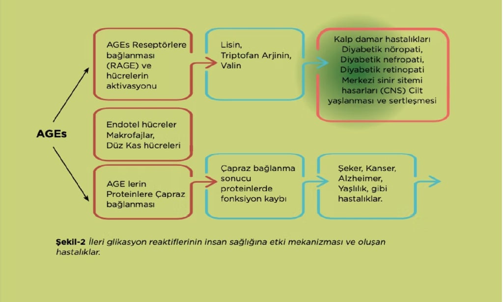 Sonuç: Besinlere lezzet katan pişirme yöntemleri, ne yazık ki yaşlanmayı hızlandıran ve dokularda biriken AGE’lerin oluşumuna neden olmaktadır. Daha sağlıklı pişirme yöntemlerini ve AGE içeriği az gıdaları tercih etmek, kronik hastalıkların gelişimini önlemede ve hücrelerimizi korumada kritik bir stratejidir.