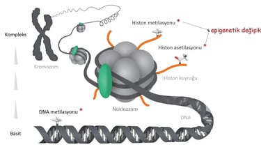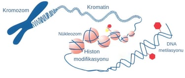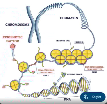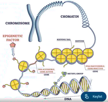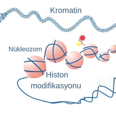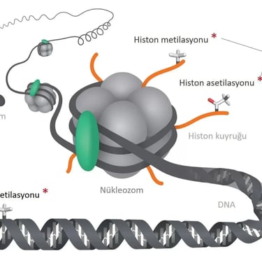 Histon Modifikasyonları (Ayar Makaraları): DNA'nın sarıldığı histon proteinlerine kimyasal etiketler ekleyerek/çıkararak yapıyı gevşetir veya sıkar. Bu sayede genler erişilebilir (aktif) veya erişilemez (pasif) hale gelir.