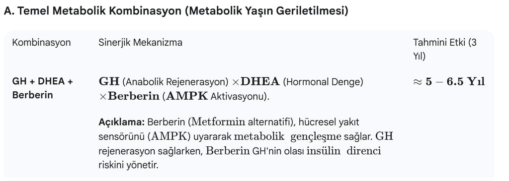 GH + DHEA + Berberin: GH (Anabolik Rejenerasyon) DHEA (Hormonal Denge) Berberin (AMPK Aktivasyonu). ortalama 5-6.5 Yıl gençleşme