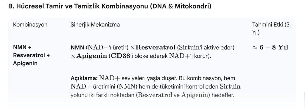 NMN + Resveratrol + Apigenin: NMN (NAD+'ı üretir) Resveratrol (Sirtuin'i aktive eder) Apigenin (CD38'i bloke ederek NAD+'ı korur). ortalama 6-8 Yıl gençleşme etkisi
