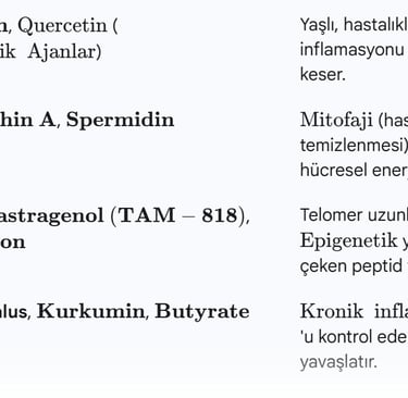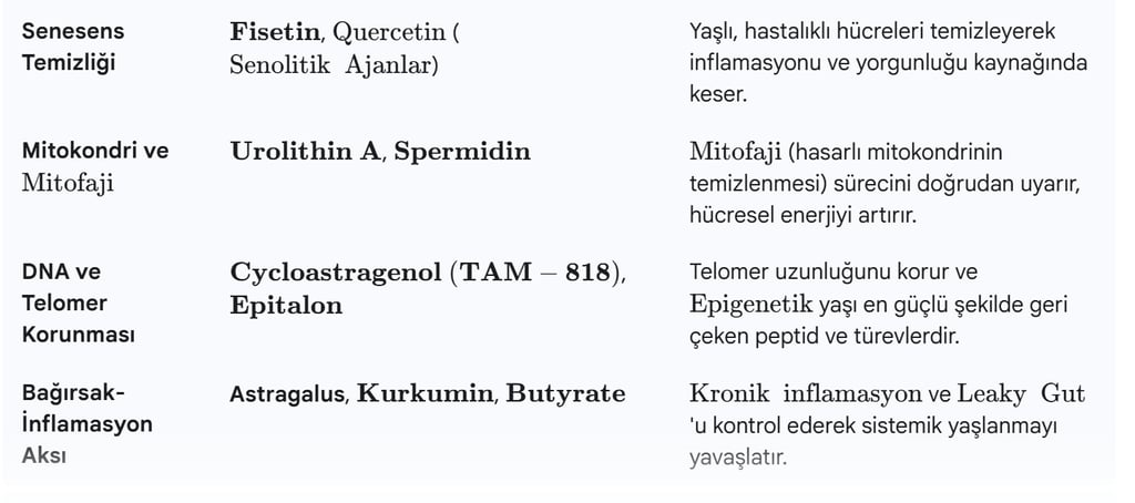 Kilit Metabolitler: Fisetin (Senolitik) Quercetin ve Urolithin A (Mitofaji indüksiyonu).