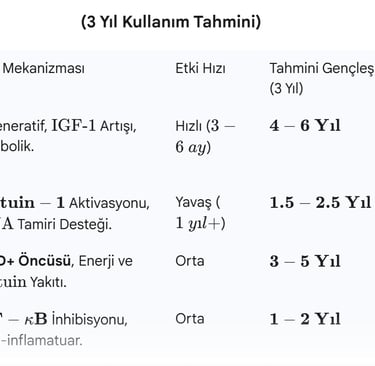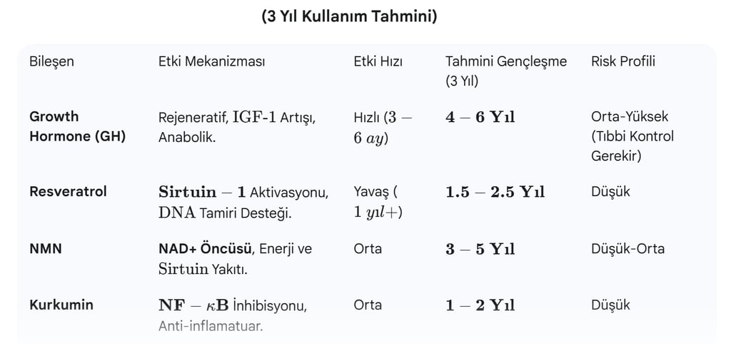 Örneğin, tek başına Growth Hormone (GH), kas kütlesini artırarak ve IGF-1 yükselterek hızlı (3 yılda ort. 4-6 yıl) rejenerasyon sağlar; ancak metabolik ve hücresel koruma için Resveratrol (daha yavaş ama güvenli koruma) ve Berberin (metabolik denge) gibi farklı ajanlarla birleştirilmelidir.