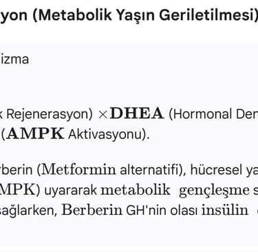 Açıklama: Berberin (Metformin alternatifi), hücresel yakıt sensörünü (AMPK) uyararak metabolik gençleşme sağlar. GH rejenerasyon sağlarken, Berberin GH'nin olası insülin direnci riskini yönetir.