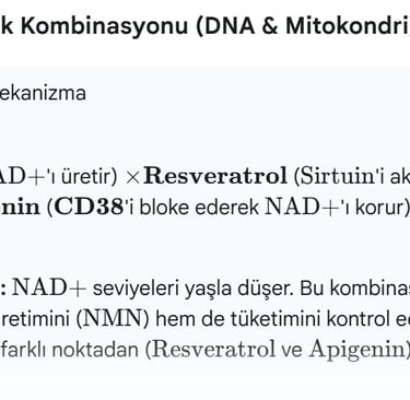 Açıklama: NAD+ seviyeleri yaşla düşer. Bu kombinasyon, hem NAD+ üretimini (NMN) hem de tüketimini kontrol eden Sirtuin yolunu iki farklı noktadan (Resveratrol ve Apigenin) hedefler.
