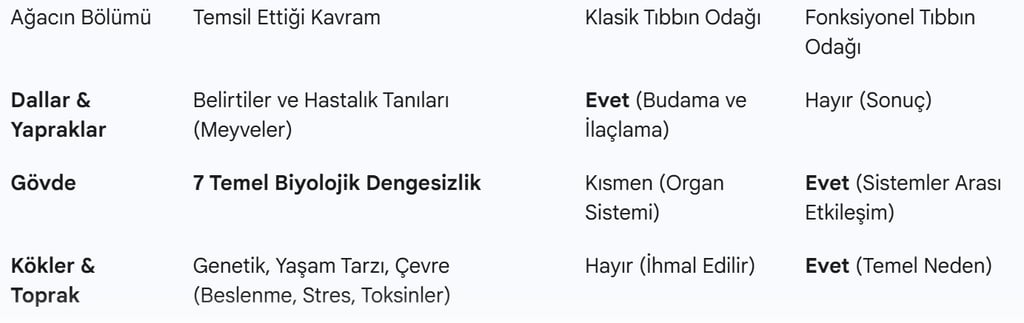 Fonksiyonel Tıp, hastalığı bir teşhis etiketi olarak görmez. Bunun yerine, biyolojik sistemlerin dengesini geri kazandırarak sağlığı ortaya çıkarma sanatıdır. Bu yaklaşım, bir ağaç metaforu ile özetlenir: